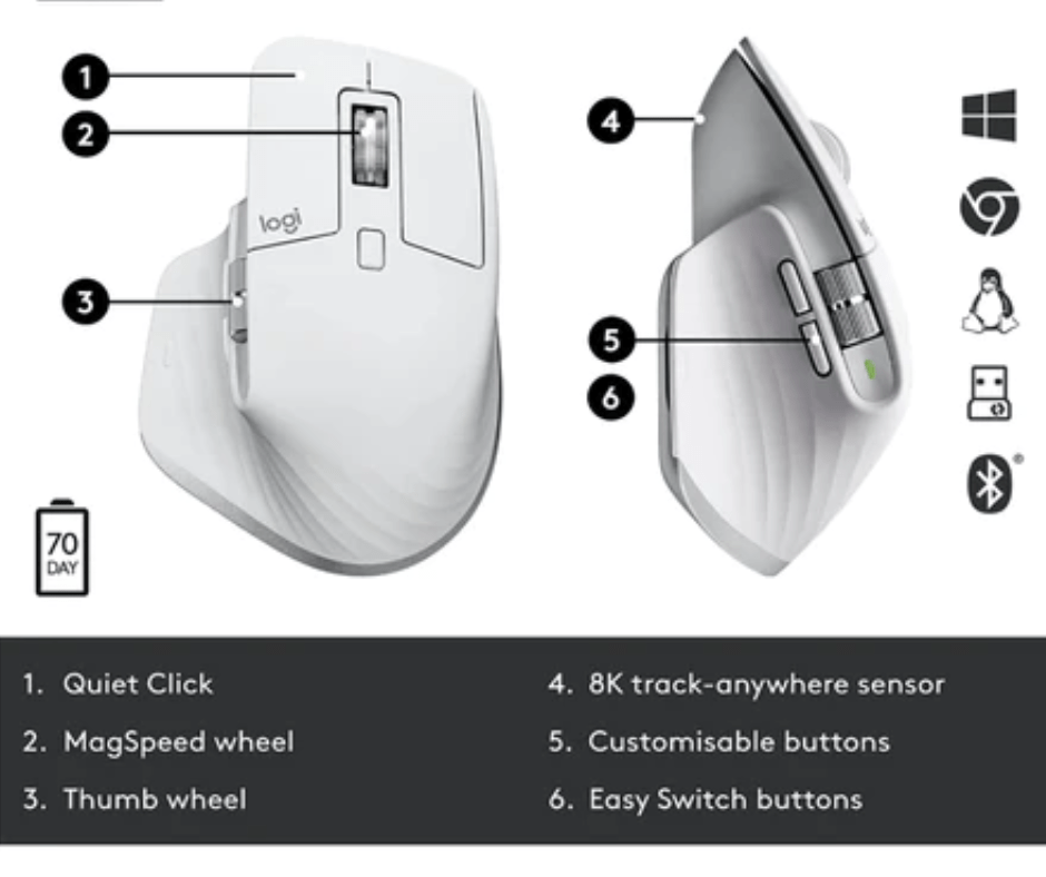 MX Master 3S is compatible with all major operating systems24Device basic functions will be supported without software for operating systems other than Windows and macOS right out of the box such as Windows, macOS, Chrome OS™ or Linux®. Your mouse instantly pairs with up to three devices via Bluetooth Low Energy or the included Logi Bolt USB Receiver25Not compatible with Logitech Unifying technology.